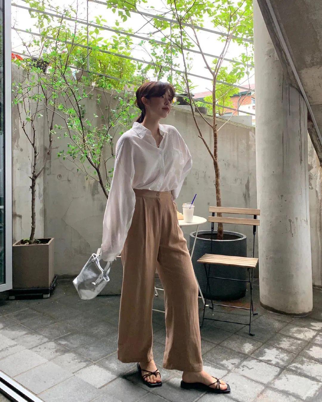 3. 白衬衫+棕阔腿裤:秋日氛围感,温柔又沉稳