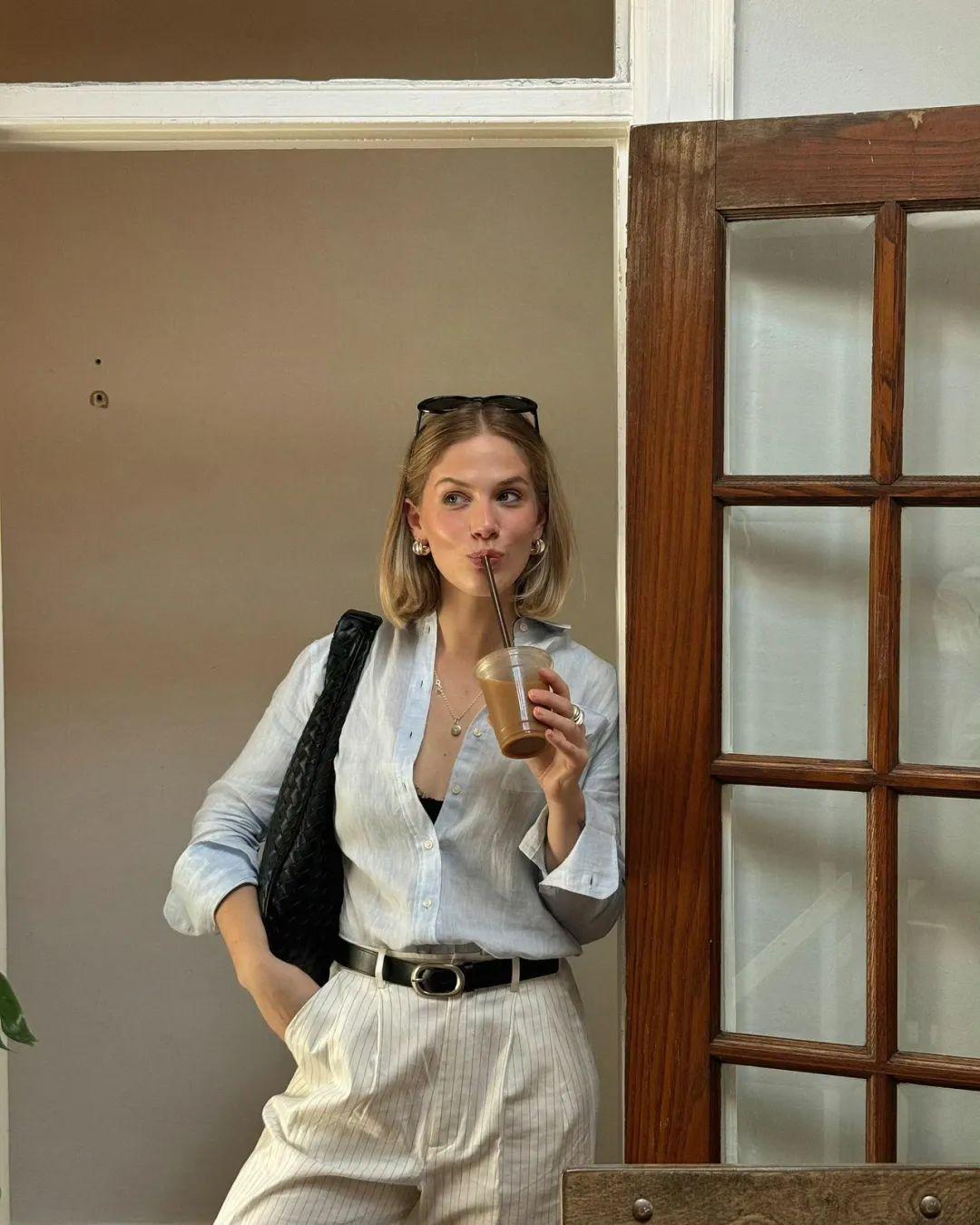 一、蓝衬衫+白阔腿裤:清爽感拉满,通勤出街都能穿