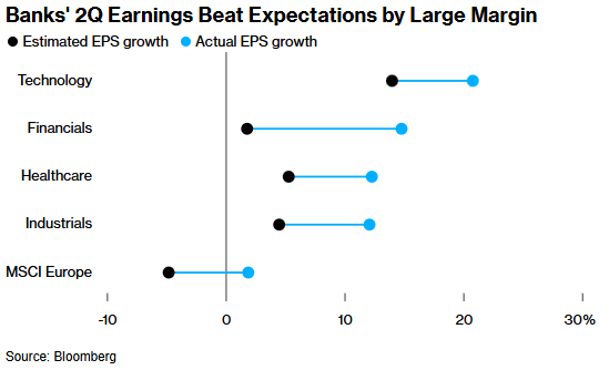 第二季度,MSCI欧洲金融子指数盈利增长15%,远高于预期的1.8%,是所有板块中超出预期幅度最大的。