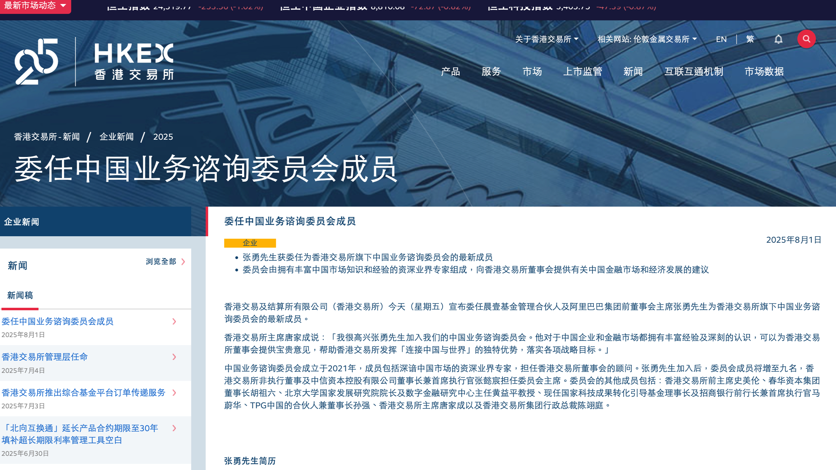 前阿里巴巴CEO张勇履新,加入港交所旗下中国业务咨询委员会张勇获委任为香港交易所旗下中国业务咨询委员会的最新成员。